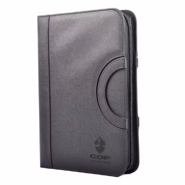 COP dokumentmapp gjord av slitstark polyuretan/syntet med justerbar smartphonehållare i A4-format. Den har även två infällbara bärhandtag som hålls på plats av en magnet när de är vikta. Mappen stängs med en 2-vägs dragkedja så att allt förblir säkert i mappen och du har allt klart framför dig på mötet på ett elegant sätt.