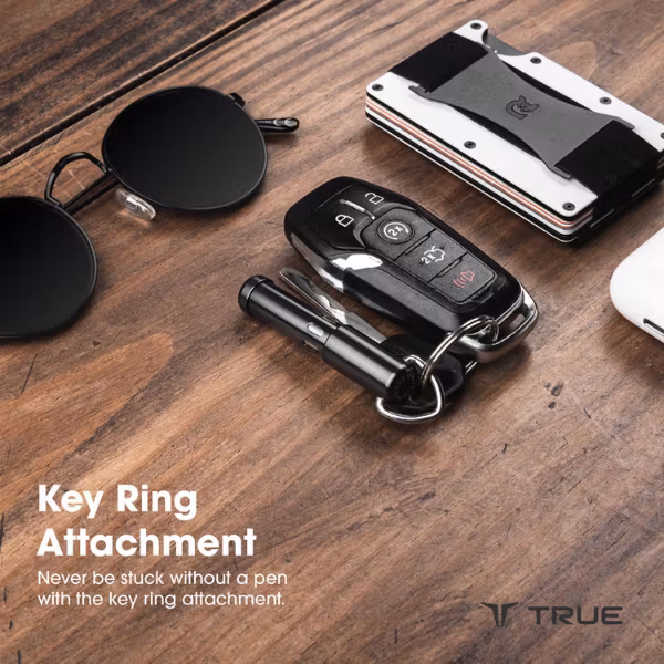 Den lossnar helt enkelt från sitt kraftfulla magnetiska lock och sträcker sig till full längd med bara ett drag. Förvarra i nyckelringen och ha alltid en bekväm penna i full storlek till hands. Tillverkad av borstat rostfritt stål och anodiserat yttre hölje av flygplansaluminium. 3x extra svart påfyllningsbläck ingår.