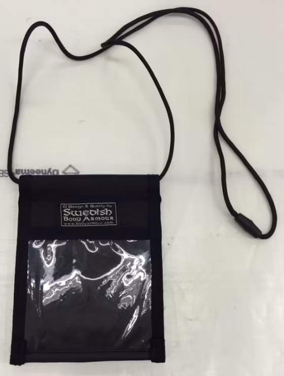 * På andra sidan sitter ett genomskinligt fack så att du kan bära hållaren runt halsen med t. ex. ID kort eller visitkort i ytterfacket väl synligt. Sitter stadigt i fickan eller uniformen och brickan / ID är alltid väl synlig. Säkerhetssnöre att ha runt halsen medföljer som självutlöser vid drag för att förhindra olyckor och är avtagbart.