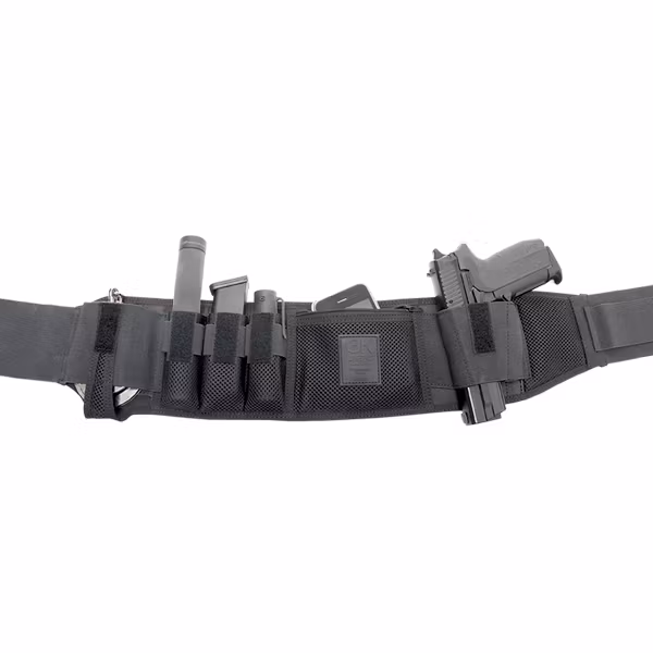 Justerbara elastiska band som stängs med kardborrband. Med detta bälte får du med all den utrustning som du behöver vid ett ingripande såsom pistol, magasin, handfängsel, batong, försvarsspray, radio etc.