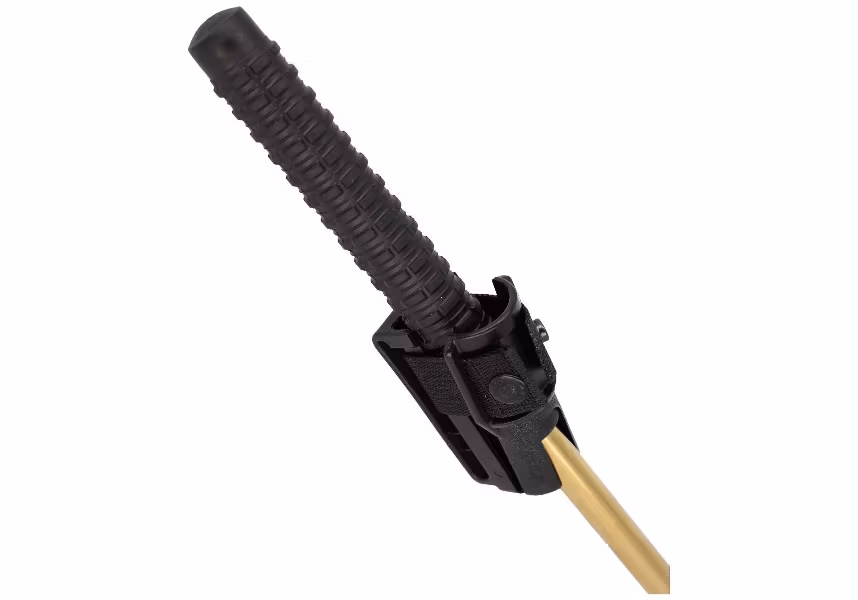 Räfflat gummihandtag som ger mycket säkert grepp. Smart 360graders justerbart hölster i svart polymer medföljer. Batongen kan hölstras i utfällt läge.