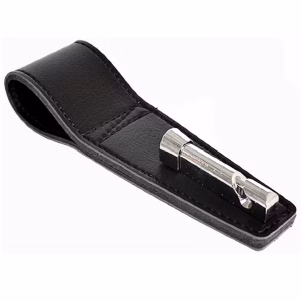 Klassisk bälteshållare i svart läder och kromad metall för gummibatongen.