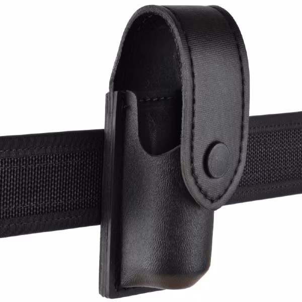 OC-hållare från Safariland med lock i svart nylon för bälte.
