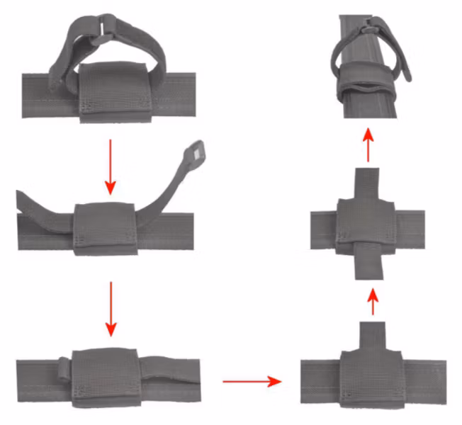 Infästningen har en kardborreförslutning och kan fixeras eller avlägsnas från bältet utan att man behöver ta av bältet.