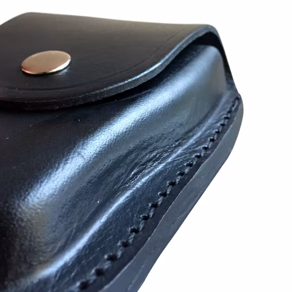 Kraftigt fängselfodral av omtyckt modell i läder med lock som låses med tryckknapp.