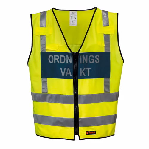 Reflexväst för ordningsvakt som är godkänd och CE märkt enligt EN 471 klass två. Dragkedja fram, två fickor med kardborrestängning, bröstficka, monofonhållare.