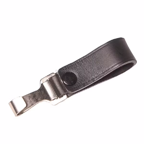 Passar de flesta bältesmodeller. Nyckelhållare tillverkad i slitstark läder med fjäderbelastad krok i metall. Låses i bältet med tryckknapp. Mycket hög kvalité. Passar alla standard utrustningsbälten. Total längd: 13 cm