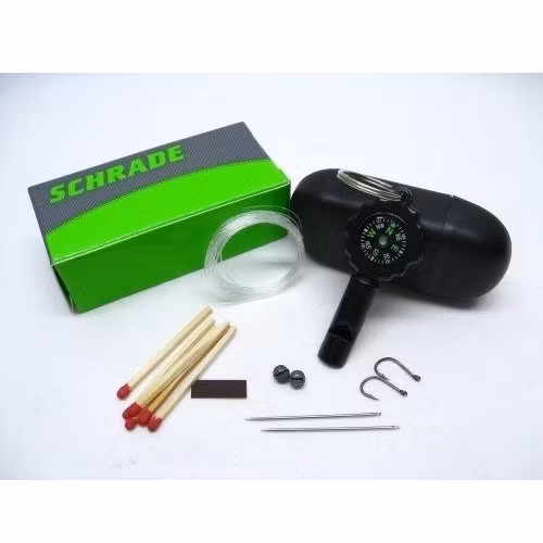 Schrade Survival Kit tillbehör, inkluderande Visselpipa med kompass nyckelring, 2 Fiske Krokar, 2 vikter, 6 tändstickor, 1 tänd yta och Vattentät behållare.