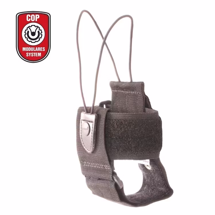 Universal radiohållare från COP. Justerbar i både längd och brädd. Elastiska band för att säkra radion i hållaren. Fästes vertikalt i ett snabbfäste i bältet (säljs separat). Ni kan då enkelt lösgöra hållaren från bältet. Maxbredd på bälte är ca 5,5cm.