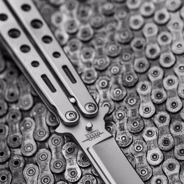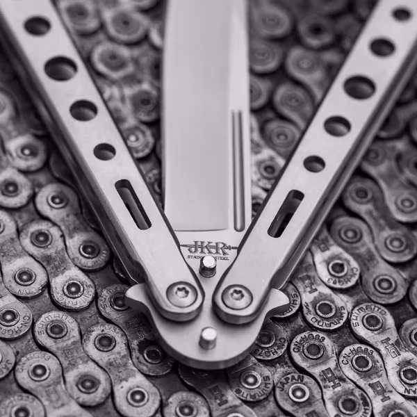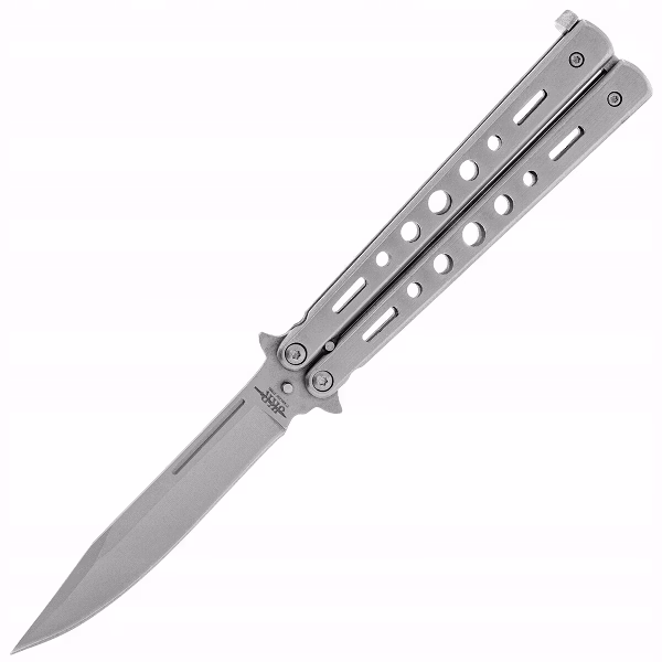 En gedigen REPLIKA av en klassisk fjärilskniv med clip point-blad av 420 rostfritt stål, som kännetecknas av mycket hög korrosionsbeständighet. Konstruktionen i helt stål och monteringen med skruvar garanterar lång, felfri drift. Säker användning av kniven säkerställs av ett Notch-lås.
