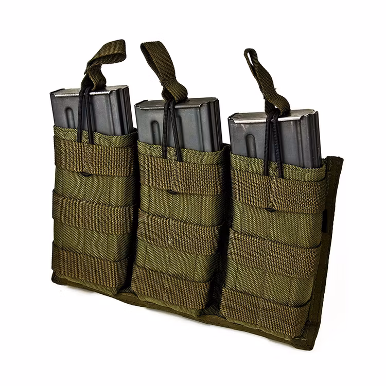 Holds three 30 round 5.56 magazines in flat configuration. Open top design with bungee retention. Attaches to modular webbing with 3 long MALICE CLIPS® (included). Available in Black, Coyote Brown, OD and Ranger Green.