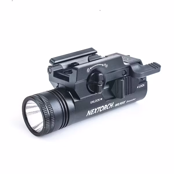 Nextorch vapenlampa med 230 lumen som levereras med CR123A batteri samt ett universalfäste för skena som möjliggör montering för de flesta weaver/picatinny baser.