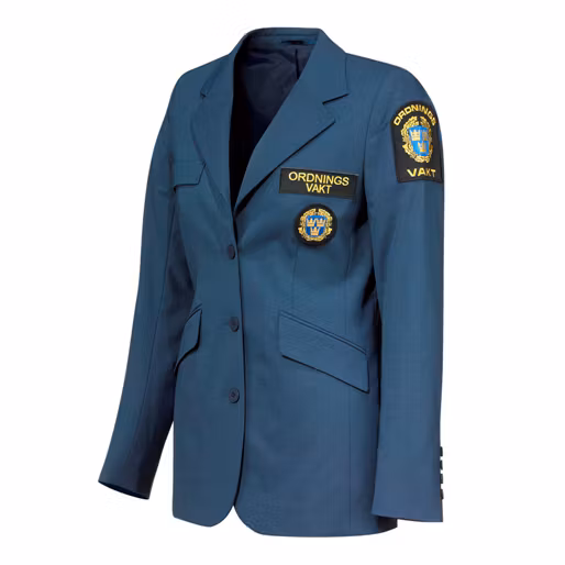 Damkavaj med dubbla sidfickor försedda med ficklock. 2 stycken innerfickor på vardera sida + en mindre på högersida. Dubbel slists baktill. Tunna axelvaddar, ordningsvaktsemblem på vardera ärm samt funktionsbeteckning på bröstet.