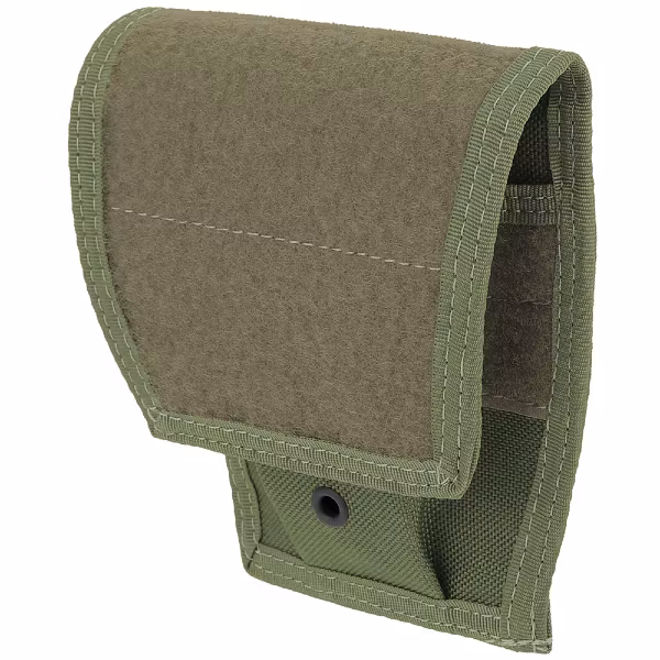 MOLLE-kompatibel ficka för två par handfängsel som passar utmärkt på den svenska stridsvästen. Kardborre på framsidan där du exempelvis kan fästa namn eller ID-brickor.