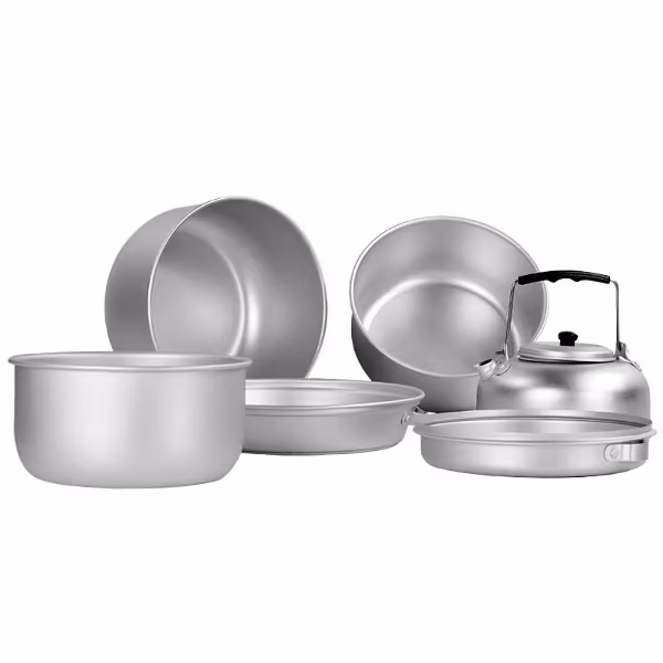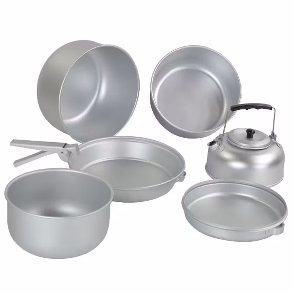 Ett fantastiskt matlagningsset i aluminium för äventyren, campingen eller stugan. Ät dina måltider utomhus med denna fantastiska uppsättning av köksutrustning.