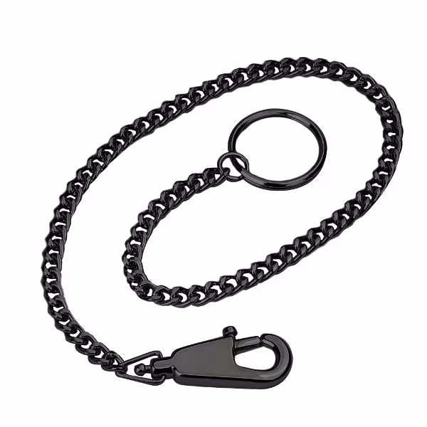 Chain with a carabiner and key ring. Made of steel/zink. The carabiner can be attached to the belt loop of the trousers. The length of the chain allows you to carry the equipment inside the pockets of cargo pants.