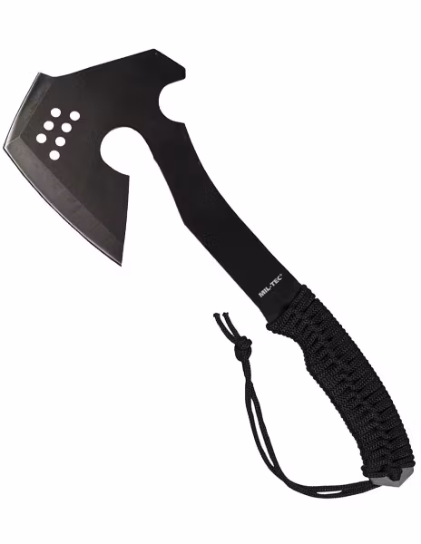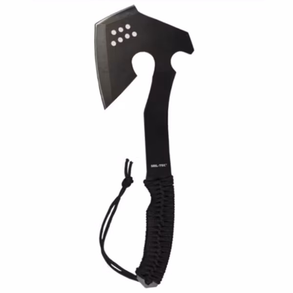 Paracord yxa från MIL-TEC. Yxan är tillverkad av 3CR13MoV stål och har paracordband som handtag. Yxan är endast 4mm tjock rakt igenom. Fungerar utmärkt ute i skogen att förbereda brasan med. Ficka till huvudet medföljer.