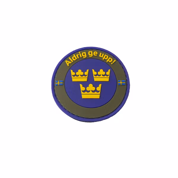 En snygg och stilrent PVC 3D Svensk gummi märke med tre kronor, med kardborre på baksidan.