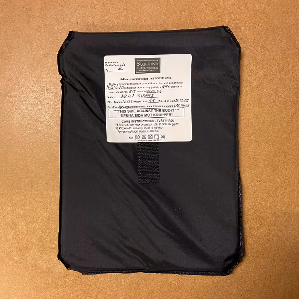 Denna unika skottskyddsplatta från Swedish Body Armour är designad för att stoppa vanliga skott från en AK47:a (7,62 x 39 mm).