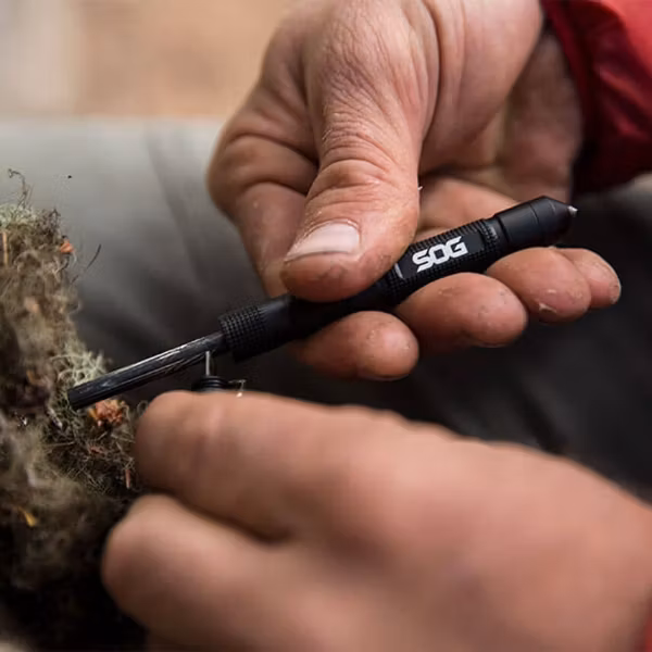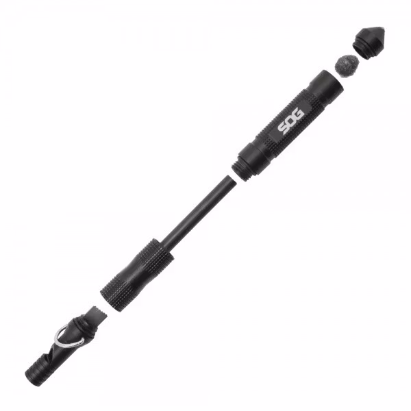 Det är svårt att hitta ett verktyg med så många överlevnads funktioner som i sogs Flint, med en storlek söm inte är större än en penna. Flint har ett inbyggt tändstål, samt ett inbyggt fack för fnöske, samt en glaskross med karbid spets och visselpipa.